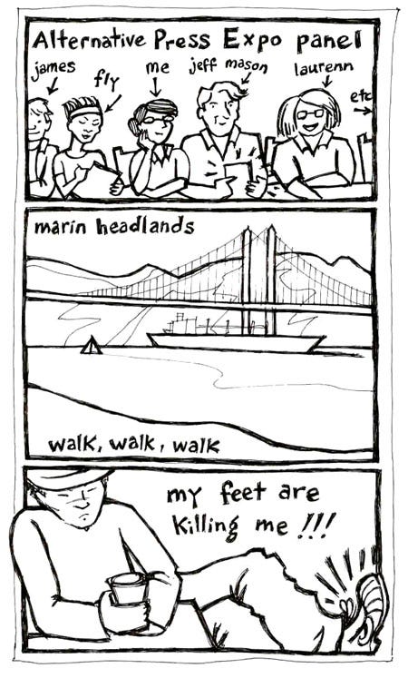 Why did I go to San Francisco? For the Alternative Press Expo, which was happening in the Herbst Pavilion (here’s a 2015 article I found about the history of this cool building, right on the waterfront). A few months before, I’d contributed to a comics anthology called 9-11 Emergency Relief, published by Alternative Comics. I went to San Francisco to be part of a panel at APE. I drew some of the other panellists: James Kochalka, Fly, Laurenn McCubbin, and publisher Jeff Mason. I wrote about meeting Jeff Mason at the San Diego Comic Con in this episode a while back.