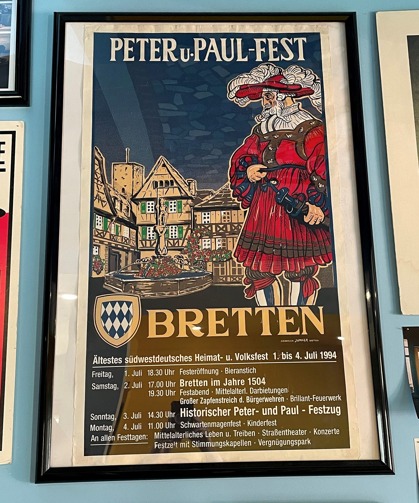In the town where I lived in Germany, there’s a festival every year on the Feast of Saints Peter & Paul. It’s supposed to commemorate a medieval victory over some besieging enemies, but in modern times it’s also just a big medieval-themed party. You can drink Wein-Schorle out of these ceramic cups stamped with the town crest. I still have those cups!