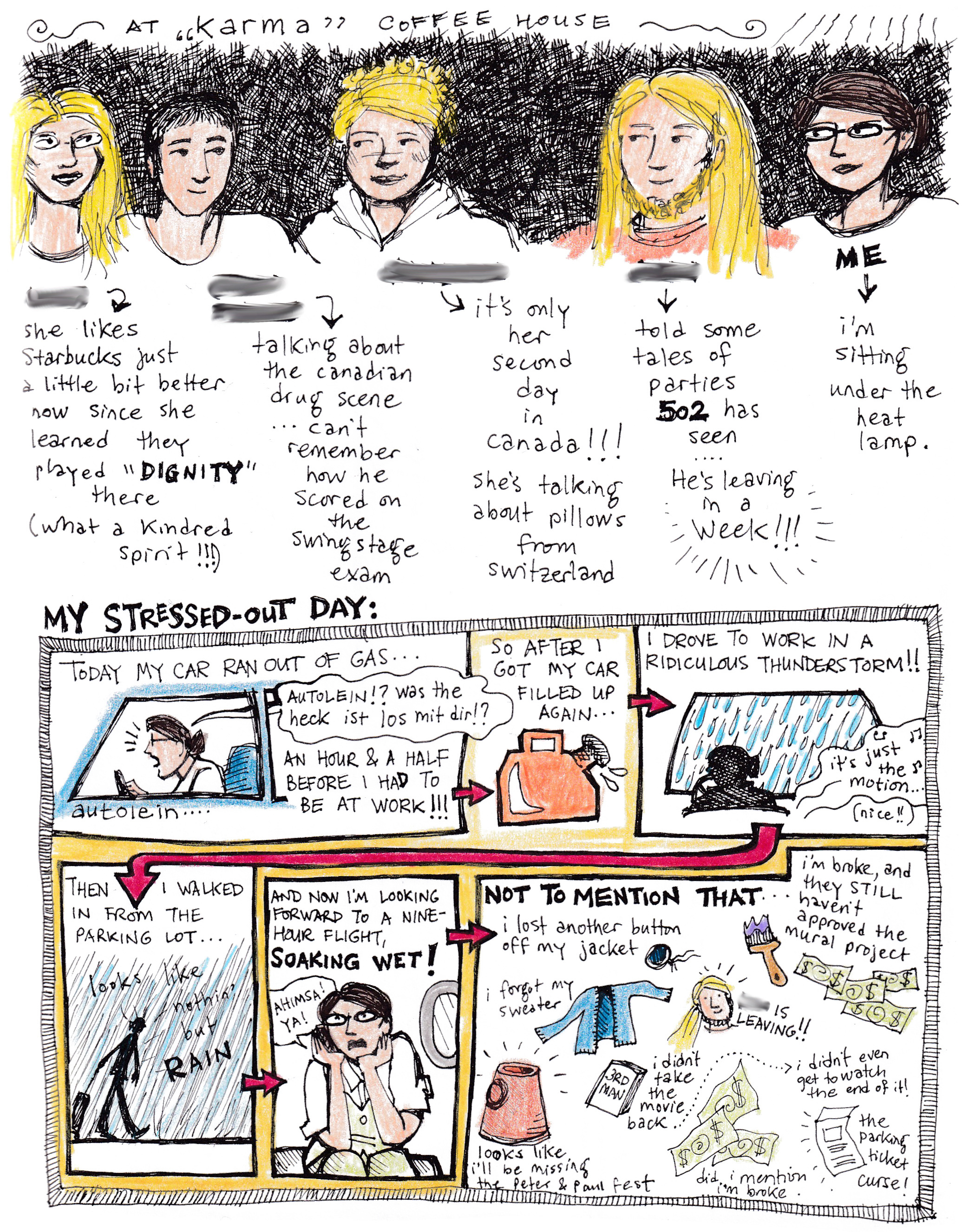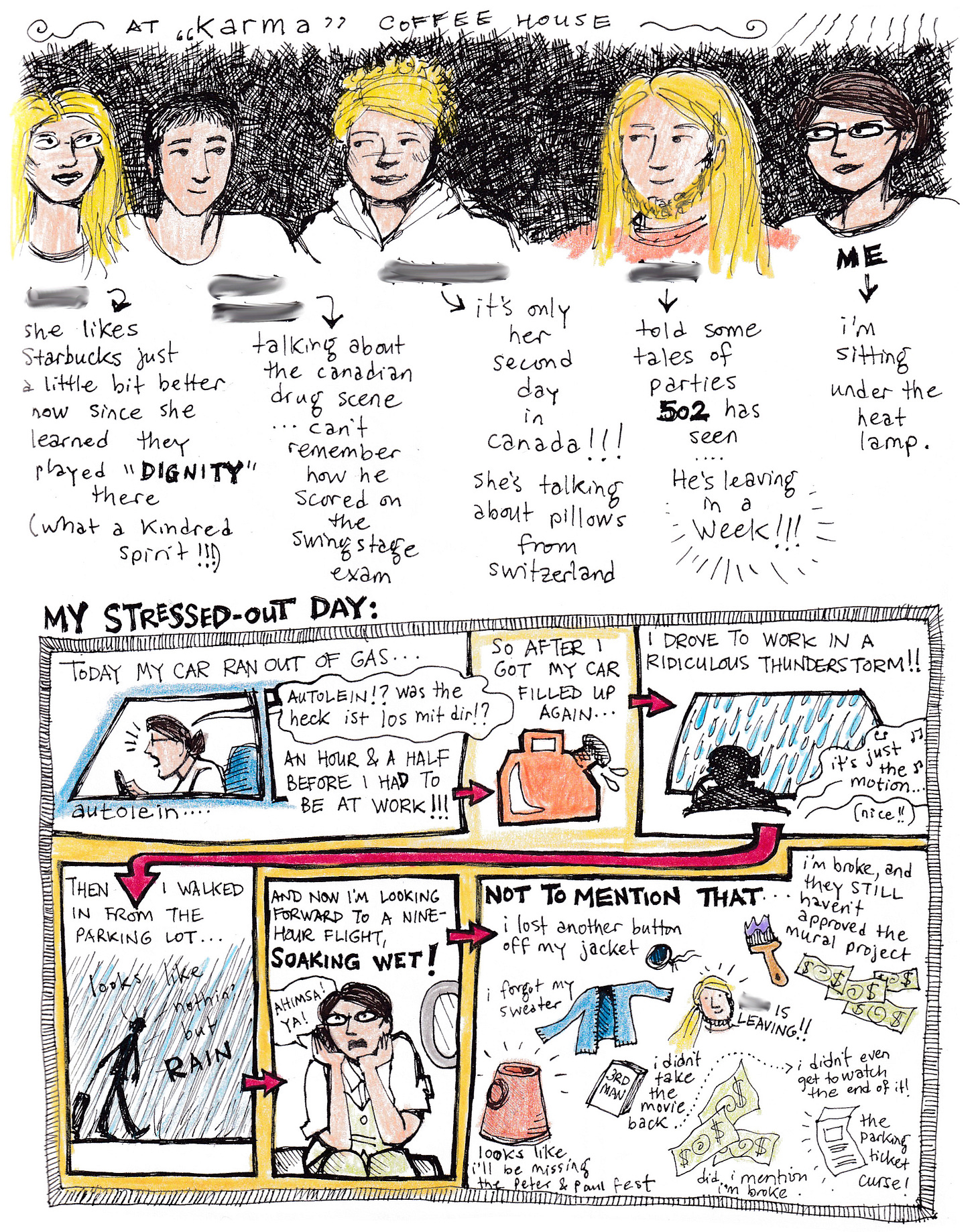 The next page was drawn at “Karma” coffee house. It used to be in the Calgary neighbourhood of Marda Loop. I think it was destroyed in a fire. Too bad! These days, it’s just an empty lot. But back then, I recorded a conversation that mentions another great Bob Dylan song, Dignity!