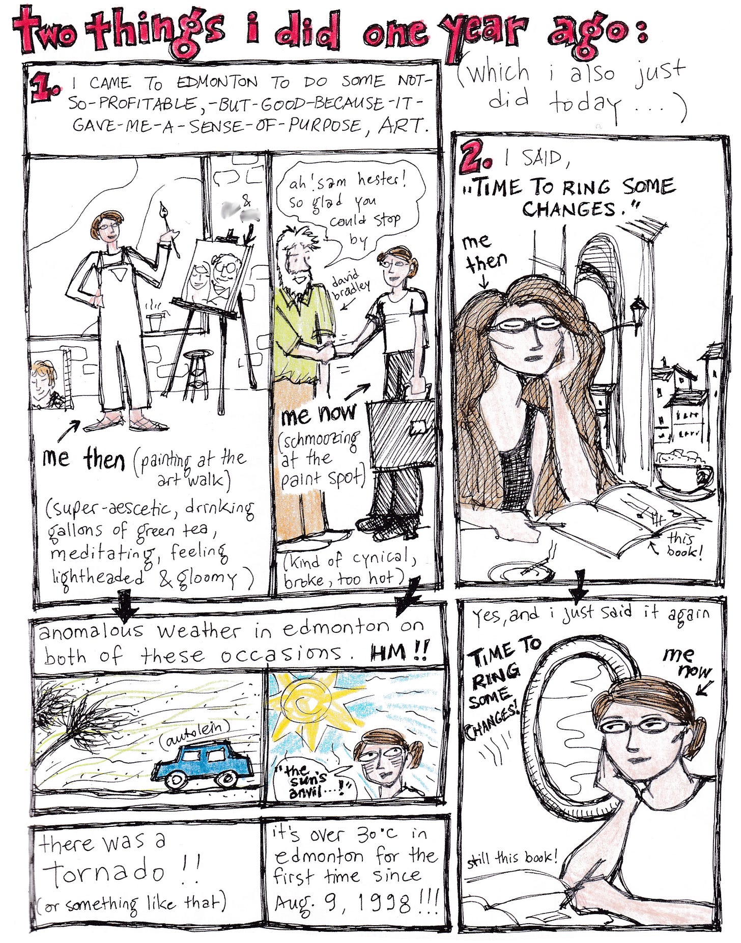 Ok, here’s the last page for today. On this page, I’m remembering one year earlier, in the summer of 2000, when I was trying to figure out how to survive getting my heart broken by my then-boyfriend. What did I do? I said, “Time to ring some changes” (the title of an excellent song by Richard Thompson - I couldn’t find it online, but here’s a live version), and I went to Edmonton. Not sure if the latter is necessarily the best thing to do when you get your heart broken, but that’s how things went for me.