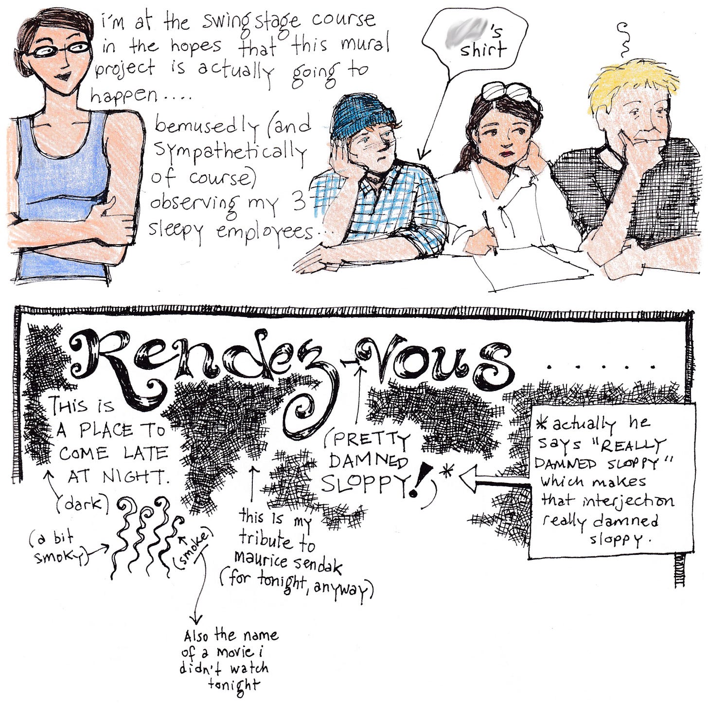 Later that day (long after the early-morning swingstage course), I ended up at a hangout for Calgary night owls called Rendez-Vous. I don’t know if I even remember where this place was! Maybe on 12th Avenue SW? Anyway, that page has a reference to a line from Persuasion (a line I also quoted in this episode)… a mention of Maurice Sendak (hopefully you know who that is) and his wonderful cross-hatching… and Smoke, a movie I didn’t watch that night. I did watch it eventually, though.