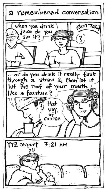 I’m pretty sure that the reason I was sitting in that early morning airport and feeling really grouchy, was because I had just travelled to Toronto from Calgary on the all-nighter, and now I was standing by for a flight that was supposed to take me to a Bob Dylan show in the States. I feel like it was Chicago, but maybe New York? Somewhere that I didn’t get to. A blizzard cancelled the flights, and I ended up just going back to Calgary. I drew these pictures in late 2001, and Bob’s 2001 tour wrapped up in November… so I’m not sure which show I missed.