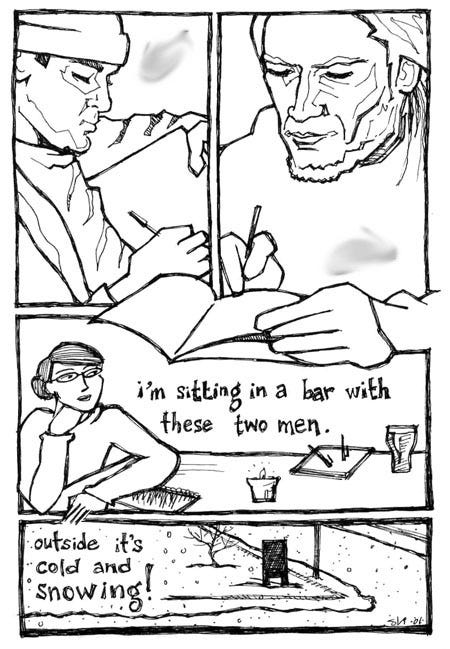 As I wrote in a previous post, the idea was for me to draw a bunch of pages, just as I would usually do in my old sketchbooks, and then about once a month I’d scan them and give them to a web hosting friend who would post them online for me. I tried to make these pages as spontaneous and random as my old sketchbooks, but the format of the boxy panels still felt a bit restrictive. One thing was the same, though: I often found myself drawing in late-night bars… or while trying to kill time in airports.